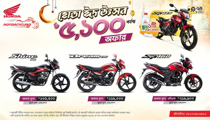 Bangladesh Honda Private Limited is pleased to announce the “Honda Eid Offer” up to BDT 5,100 along with a free Engine Oil and 7 Free Services on Honda SP125. Eid ul-Fitr represents happiness and it is a major holiday celebrated by Muslims around the world. As a part of the celebration of the upcoming Eid festival, “Honda Eid Offer” has been announced for Bangladesh Honda’s popular models.